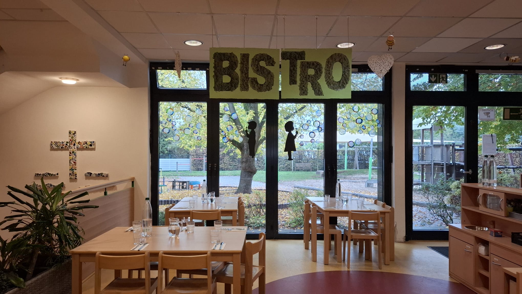 Im großen Flur befindet sich das Kinder-Bistro. Hier nehmen die Kinder ihr Mittagessen ein.