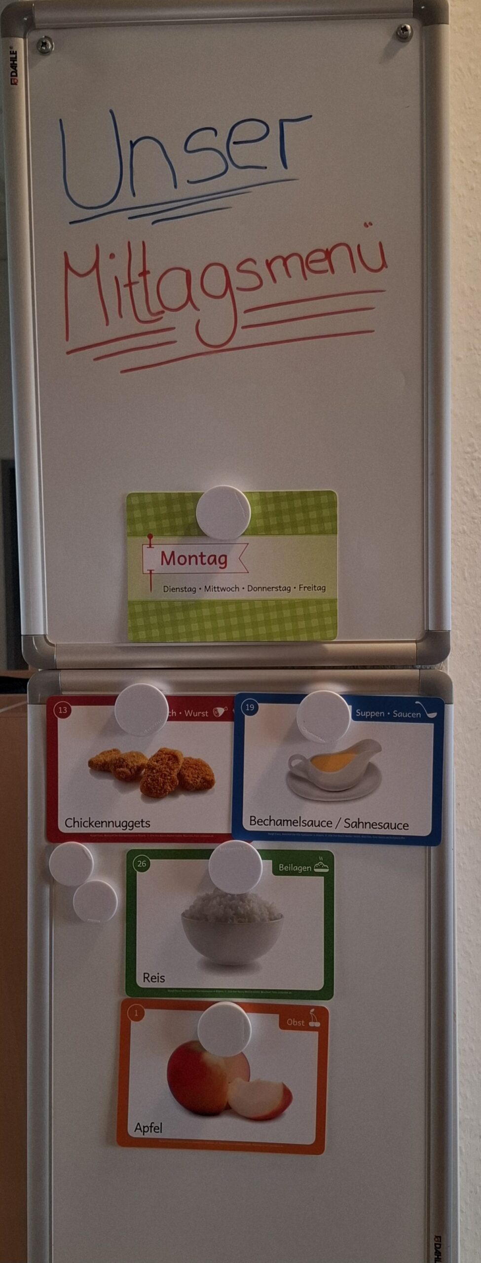 Im Gruppenraum der Blaubären befindet sich das Kinder-Bistro. Hier nehmen die Kinder ihr Mittagessen ein. Hierzu gehören auch die neuen Bildkarten, welche den Kindern täglich aufzeigen, welches leckere Essen sie erwartet.